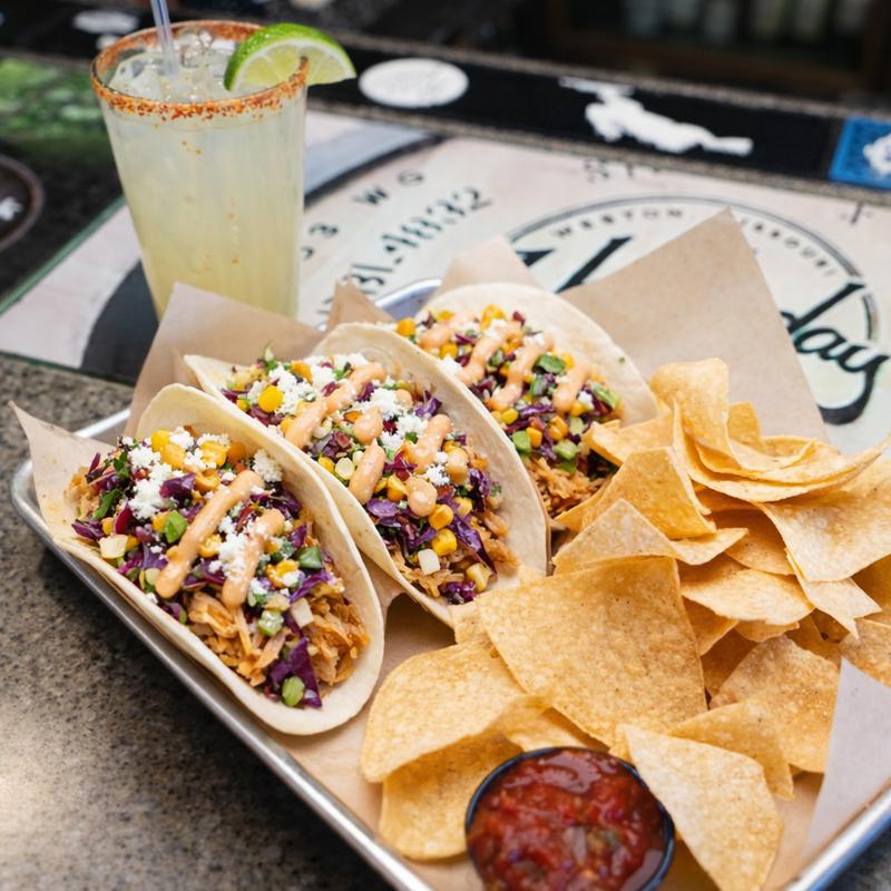 Corn or flour tortilla filled with marinated chicken, spicy cabbage slaw, cotija cheese and corn pico topped with chili crema. Served with chips and salsa.